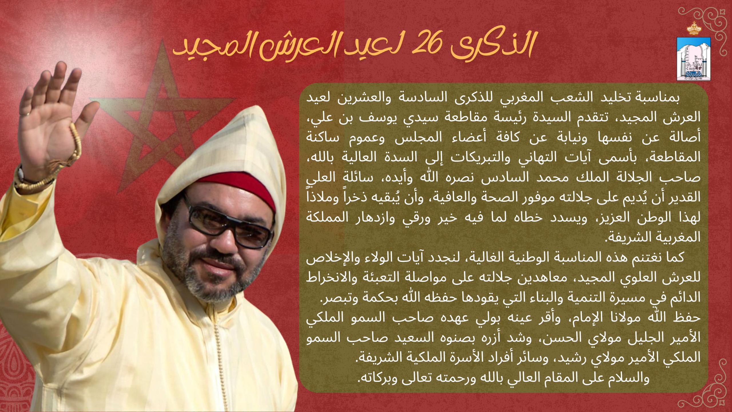 بمناسبة تخليد الشعب المغربي للذكرى السادسة والعشرين لعيد العرش المجيد، تتقدم السيدة رئيسة مقاطعة سيدي يوسف بن علي، أصالة عن نفسها ونيابة عن كافة أعضاء المجلس وعموم ساكنة المقاطعة، بأسمى آيات التهاني والتبريكات إلى السدة العالية بالله،